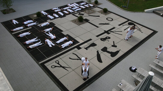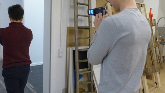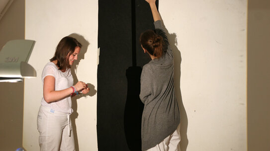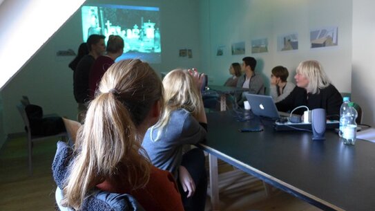 Im Workshop "Videofilm" gab es zunächst eine kleine Einführung mit Filmbeispielen. Die Studierenden bildeten kleine Impro-Teams und bekamen einige strenge Vorgaben, um die theoretisch endlosen Möglichkeiten des Mediums Film ein wenig einzugrenzen. Anhand von Material, das Margit Czenki mitbrachte, entwickelten die Studierenden Assoziationen, Bilder oder Geschichten und schließlich ein kleines Video.