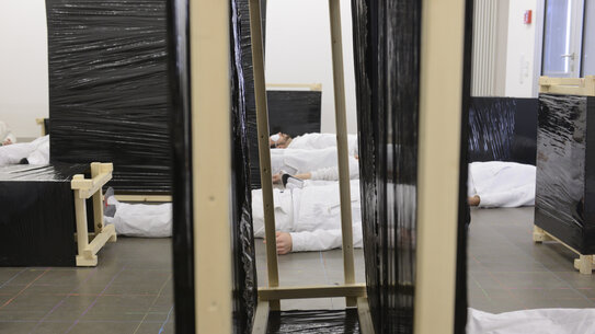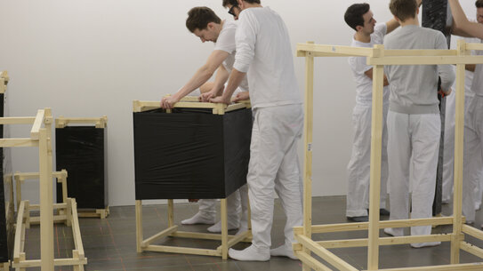 Bei der Herstellung der Strukturen spielten skulpturale und ästhetische Qualitäten eine wichtige Rolle. Zur Fertigung der Strukturen standen Holzlatten, Schrauben, Stretchfolie und Werkzeug zur Verfügung.