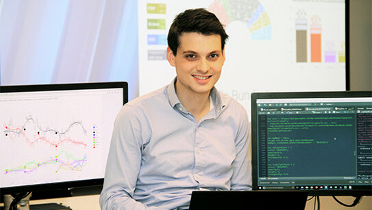 Daneben war es Marcel Schliebs weiterhin wichtig, selbst Wissenschaft zu vermitteln: So leitete er weitere Tutorien und initiierte eine StudentStudy im Bereich Angewandte Datenanalyse. Parallel dazu arbeitete er an seinem Humboldt-Projekt: „Ich habe alle 315.000 je in der Printausgabe des SPIEGEL veröffentlichten Artikel heruntergeladen und mit einem selbst programmierten Algorithmus untersucht, wie positiv oder negativ Artikel von 1947 bis 2017 über das Thema Migration berichten“, beschreibt Schliebs. Das gleiche Verfahren wendete er schließlich bei der Bearbeitung seiner Bachelorarbeit an, nur dass er diesmal nicht nur das Thema Migration, sondern auch Berichterstattung über den Arbeitsmarkt analysierte. „Anhand dieser Datensätze konnte ich die Ergebnisse der Landtagswahlen in der Bundesrepublik der vergangenen 30 Jahre ein wenig besser vorhersagen, als es Umfragen getan haben.“