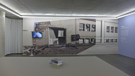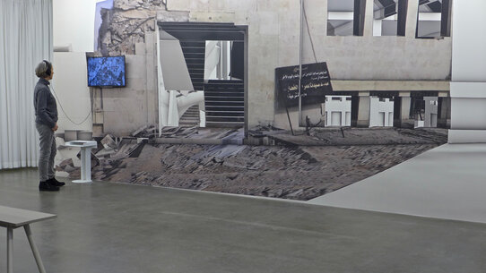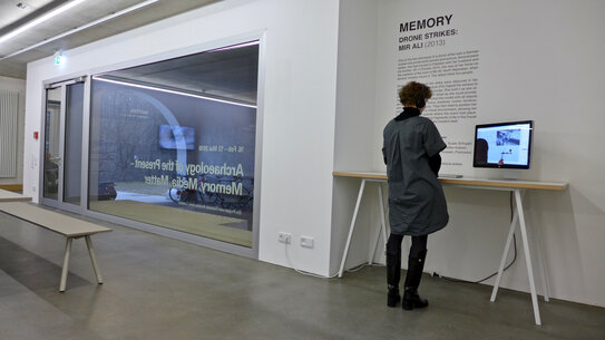 In der Ausstellung „Archaeology of the Present – Memory, Media, Matter“ zeigen Forensic Architecture nun eine speziell für die Zeppelin Universität entwickelte Präsentation. Das Kollektiv präsentiert drei Arbeiten, wobei jede Arbeit zugleich exemplarisch für eine Methode steht. Für jeden der drei Begriffe „memory, media, matter“ wird eine Arbeit gezeigt. Das Beispiel für „memory“ vollzieht den Hergang eines US-Drohnenangriffs im Oktober 2010 in Mir Ali in Pakistan nach. Unter dem Begriff „media“ wird eine Arbeit gezeigt, die auf der Basis von Handyfotografien, Satellitenaufnahmen, Medienberichten und Amateurfilmen die Gebäude und den Hergang eines US-Luftangriffs rekonstruiert, bei dem im März 2017 die mit mehreren hundert Menschen gefüllte Al-Jinah Moschee bei Aleppo in Syrien zerstört wurde. Ein Beispiel für die forensische Arbeit unter dem Begriff „matter“ stellt das fortlaufende Projekt Ground Truth dar, das auf der Basis des Abgleichs von historischen und aktuellen Luftaufnahmen ein Gebiet in der Negev-Wüste dokumentiert. Durch diesen Vergleich zeigen die Aktivisten, dass die Wüste – entgegen offiziellen israelischen Verlautbarungen – bereits lange vor 1948 von Beduinen besiedelt war. Die Ausstellung präsentiert diese drei Projekte in Filmen, Recherche-Materialien und Fotografien.