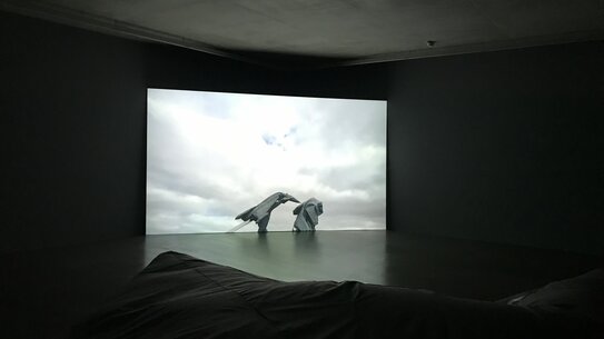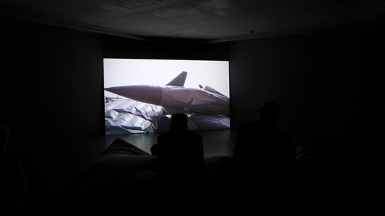 Teil der Ausstellung ist das Video Pranayama Organ (2021), in dem zwei aufblasbare lebensgroße Kampfflugzeugattrappen, ein Falcon und Typhoon, zu Protagonisten werden. Der an der südenglischen Küste gedrehte Film zeigt die beiden Dummies an einem Strand liegend. Die Flugzeugnachbildungen, die beim Militär tatsächlich verwendet werden, um den Gegner in die Irre zu führen, füllen sich langsam mit Luft, als würden sie sachte zum Leben erwachen. Im späteren Verlauf des Films treffen zwei Figuren in Kampfflugzeugkostümen, eine davon die Künstlerin, in einem absurden Tanz aus Balz, Kampf und Verführung aufeinander. Die tänzelnden, streitenden, strauchelnden Kampfgeräte erinnern an Vögel, Automaten oder Menschen, die in einem absurden Ritual ihr zwiespältiges Begehren nach Intimität und Konflikt, nach Macht und Entwaffnung aushandeln. Es entsteht ein Raum, in dem widersprüchliche Ideen von Brutalität, Verletzlichkeit, Natur, Maschinen, Heroik, Humor und Intimität ineinanderfließen.