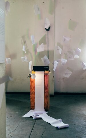 WAS IST SHIFT? Die SHIFT-Software bearbeitet und verfremdet diskriminierende Texte und druckt sie anschließend automatisch aus. In mehreren Schritten werden mit Hilfe von KI problematische Inhalte erkannt und verändert. Dabei bleiben die ursprünglichen Texte zwar erkennbar, sind in ihrer Aussage aber stark verzerrt und werden in eine lyrische Form gebracht. Die Ergebnisse füllen schließlich das Apartment – so wie Hate Speech aus dem Digitalen heraus immer mehr Raum im „echten Leben“ einnimmt.