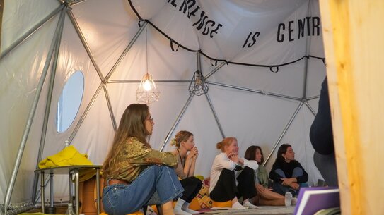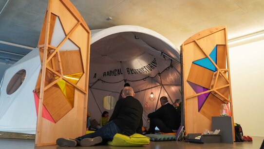 Im Rahmen von Weaving Dreams into Realities wird der von van Heeswijk gemeinsam mit Philadelphia Assembled designte und mit einem Fallschirm von Carmen Papalia ausgekleidete Dome von internationalen Kollektiven, Studierenden und Mitarbeitenden der ZU bespielt.
