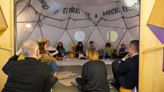 Das interdisziplinäre Ausstellungsprojekt Weaving Dreams into Realities eröffnet einen Raum, der kollektive Vorstellungskraft mobilisieren will, zugleich aber auch den Sog des kollektiven Imaginären kritisch beleuchten wird. Dafür schafft die Künstlerin Jeanne van Heeswijk mit ihrem Team und einer Gruppe von Studierenden einen Ort für ungewohnt intime und sinnliche Diskursformate. Im September 2022 wird die Künstlerin und mit ihr die Arbeit Toward Sanctuary Dome (Philadelphia Assembled, 2017) - eine geodätische Struktur für persönliche und kollektive Zuflucht, die White Box in einen Raum für kritische Praxis, kollektive Erzählungen und gemeinschaftliches Handeln verwandeln. Im Anschluss wird der Dome bis Dezember 2022 von Künstler:innen, Aktivist:innen, Forscher:innen und andere Akteur:innen bespielt, die sich mit konkreten Utopien, alternativen Organisations- und Lebensformen, wie mit gemeinwohlorientierten Ökonomien befassen. Commons, post-kapitalistische, solidarische Gemeinschaften, Kunstökonomien und wiederständige Formen des Überlebens in autoritären Staaten werden in Workshops, künstlerischen Arrangements, Interventionen und Vorträgen vorgestellt. Die Installation Toward Sanctuary Dome wurde das erste Mal im Rahmen des Philadelphia Assembled-Projekts im Philadelphia Museum of Art im Jahr 2017 gezeigt. Im Rahmen von Weaving Dreams into Realities wird der Dome einen Raum eröffnen, in welchem über drei Monate das Verhältnis von Imagination und Praxis ausgelotet wird, Perspektiven aus Kunst, Aktivismus, Pädagogik und politischer Ökonomie ins Gespräch gebracht werden, mit dem Ziel, Imaginationen als politisches Feld wiederzugewinnen, für das, was noch nicht ist, aber sein könnte.